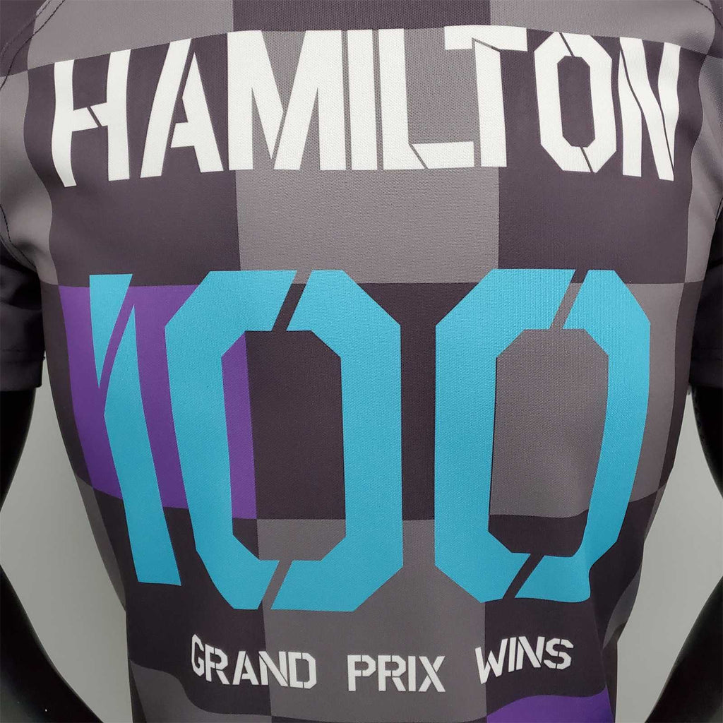 Celebre um feito que reescreveu a história do automobilismo! Esta é a camiseta oficial de edição especial, criada para eternizar o momento em que Sir Lewis Hamilton alcançou a marca histórica de 100 vitórias em Grandes Prêmios de Fórmula 1.