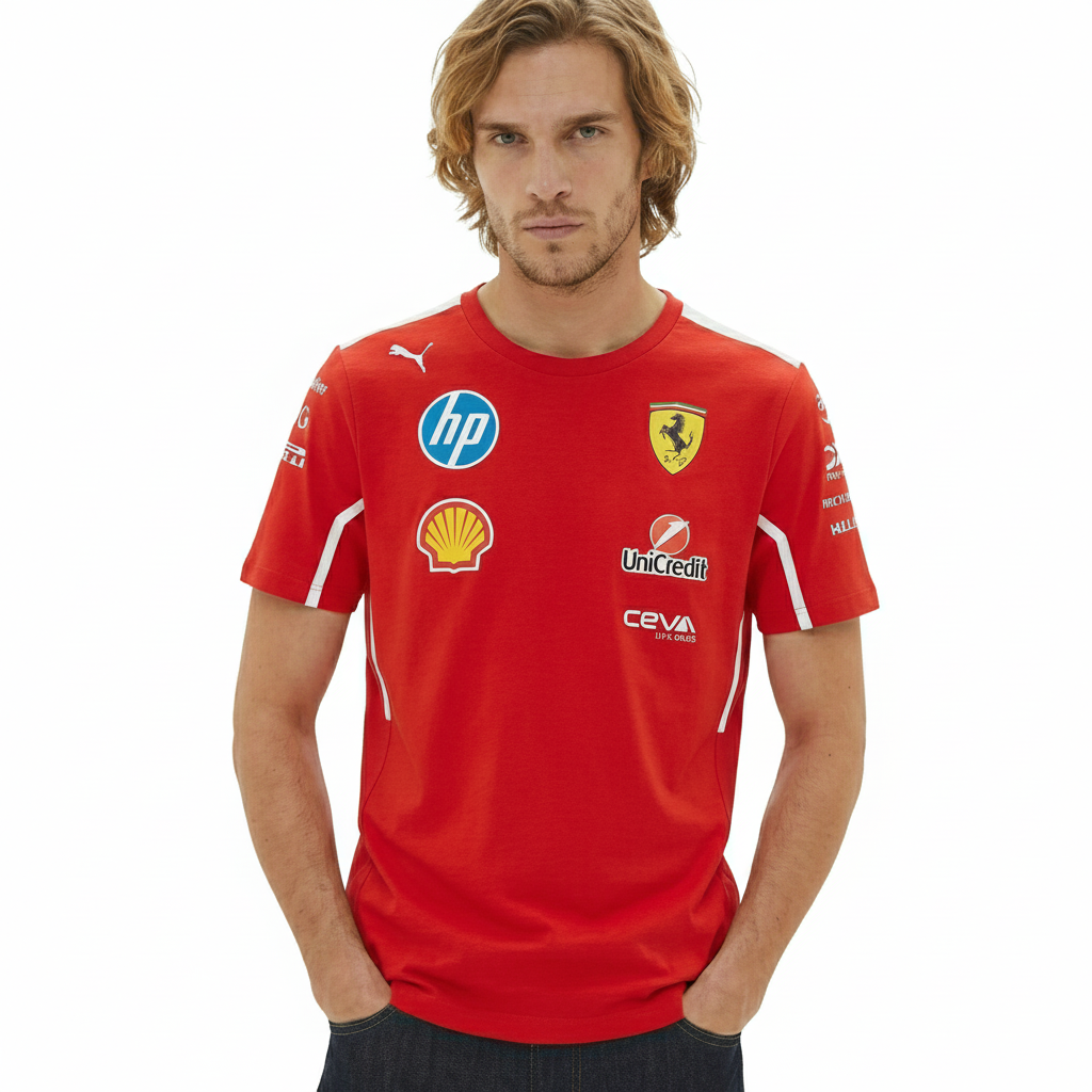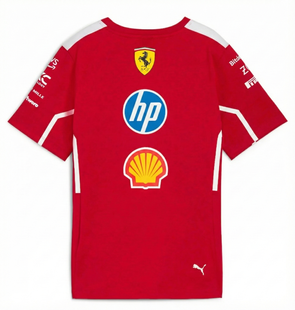 Coleção da temporada 2025, peça-chave da linha, esta camiseta é inspirada no modelo usado pela Scuderia Ferrari HP Team, refletindo as mesmas características técnicas e estéticas. A peça é confeccionada em malha de algodão parcialmente reciclado, reafirmando o compromisso da marca em reduzir o impacto ambiental. Os logotipos dos patrocinadores e os emblemas da Scuderia Ferrari se destacam mostrando a importancia dos patrocinadores da equipe.